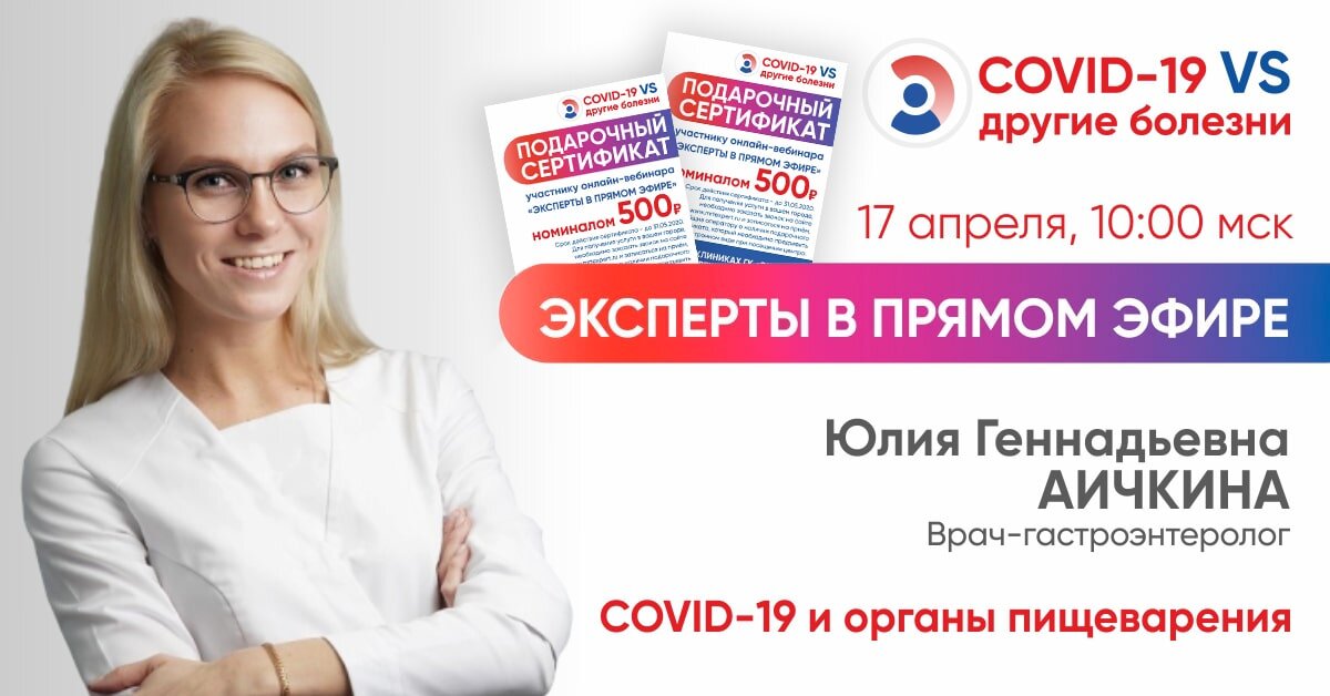 В пятницу, 17 апреля в 10.00 на канале YouTube ГК «Эксперт», Юлия Аичкина, врач-гастроэнтеролог «Клиники Эксперт» Воронеж продолжит серию просветительских онлайн-вебинаров на тему: «COVID-19 и органы пищеварения»