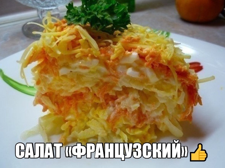 1. САЛАТ "ФРАНЦУЗСКИЙ" Люблю этот салат за то, что готовится он легко, просто и из самых доступных продуктов, которые всегда под рукой, плюс очень полезный! Я этот салат делаю за 15 мин. Подготовив все ингредиенты, я поочередно тру их на терке, сразу в салатницу. Получается быстро и очень вкусно. Нам нужно: