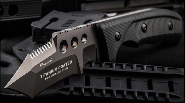 Нож выпускается под брендом HX Outdoors и позиционируется как тактический нож для выживания вообще и для кемпинга в частности. О том, что это не шутки нам говорит конструкция ножа - фултанг и толщина клинка по обуху в 4,6мм. Ага, попробуй сломай. Длина клинка составляет 98мм. Для его изготовления использовали сталь 440C закаленную до 58единиц HRC по шкале Роквелла.