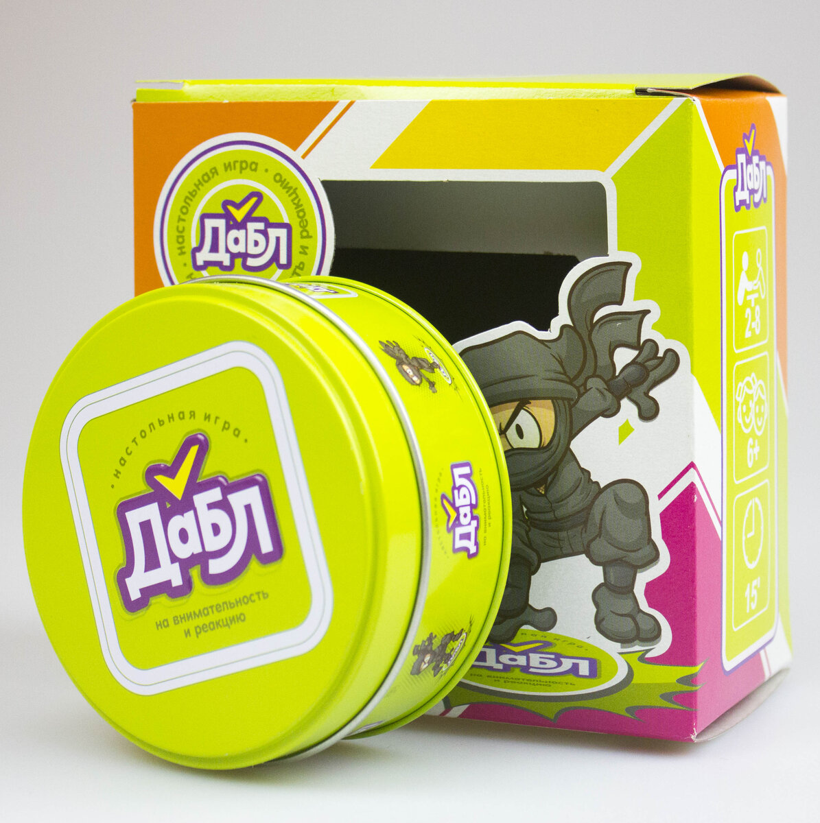 Дабл – это коллекция из 5 мини-игр в одной компактной жестяной коробочке. Мини-игры можно рассматривать как отдельный способ игры в Дабл или как один из раундов игры. Это делает игру динамичной, интересной и нескучной для компаний любых возрастов. В этой статье мы подробно расскажем про состав и правила настольной игры Дабл от производителя Десятое королевство. Состав игры Круглая жестяная коробочка, в которой хранится игра, имеет компактный размер, благодаря которому данную настолку удобно хранить дома или брать с собой в путешествие или на дачу. Высота жестяной табакерки составляет 4,5 см, а диаметр – 9,5 см. Сама игра состоит из круглых картонных карточек диаметром 8,5 см. Всего в коробочке хранится 55 карт. С одной стороны карты – рубашка, а с другой – 8 символов, среди которых встречаются изображения различных предметов, объектов или знаков разных цветов. Также в комплекте к игре идет буклет с подробно расписанными правилами игры. Кстати, если вы потеряли книжку с правилами игр