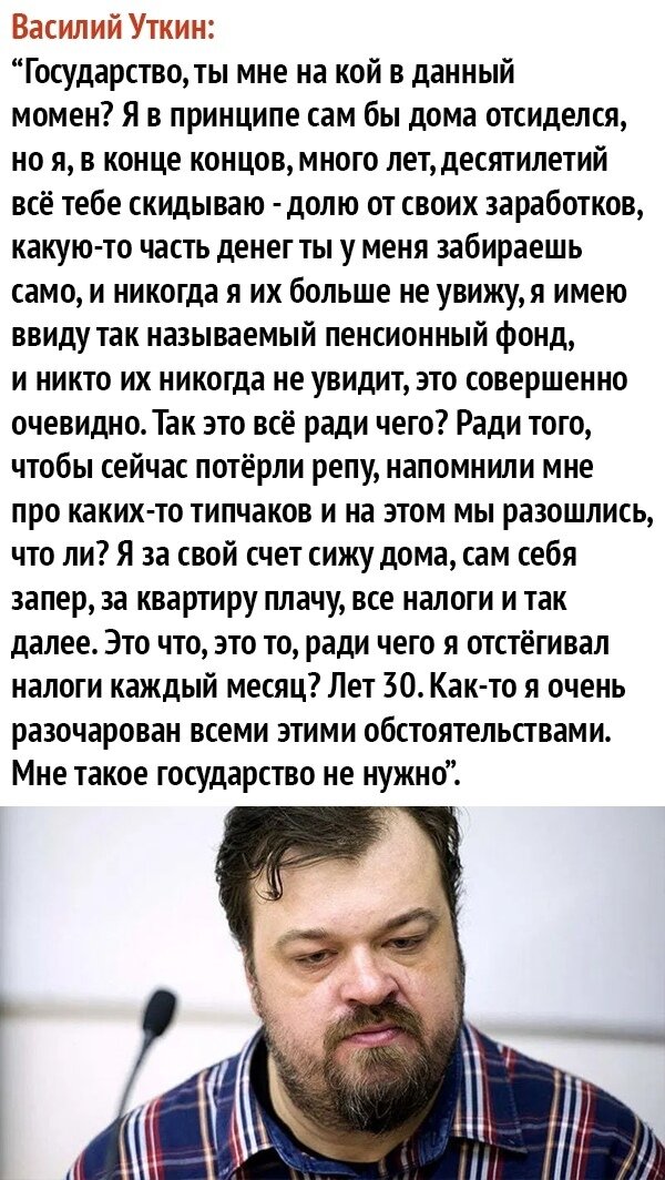 Вот еще один "человек с прекрасным лицом" подал голос. Типа я столько работаю, государство налоги плачу, а государство мне что сделало... Вот об этом давайте поговорим..