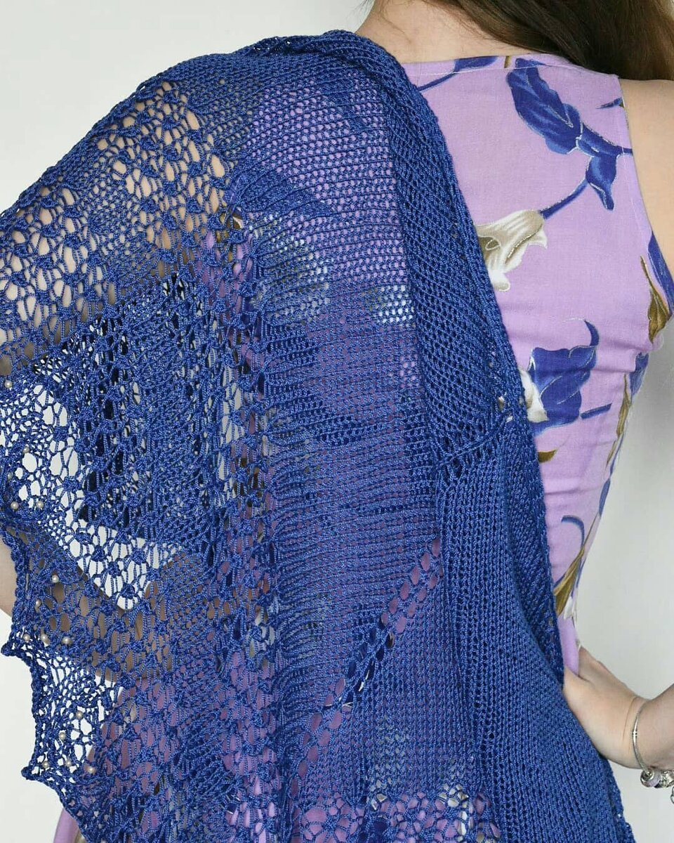 Набираем три петли обычным способом (ФОТО 1). Вяжем шесть рядов лицевыми петлями (ФОТО 2). Затем на правую спицу нанизываем три узелка правого края вязания (ФОТО 3), провязываем три петли (на правой спице образуется 6 петель - ФОТО 4). На левую спицу нанизываем три узелка левого края вязания (ФОТО 5) и провязываем их, получается 9 петель на правой спице (ФОТО 6). Делим их маркером на три кромочные петли (справа три и слева три), и одну центральную (ФОТО 7). Начинаем вязать полотно платка лицевыми и изнаночными петлями, кромочные петли ("кромка") только лицевыми, при этом в каждом лицевом ряду делаем прибавления по 1 петле к правой и левой "кромке" и по 2 две петли к "центральной" (ФОТО 8). Листайте галерею. 74 ряда вяжем лицевой гладью, после чего переходим на узор — 1. Узор вяжется следующим образом: лицевые ряды из 1 петли вывязываем (вытягиваем) 3 пет