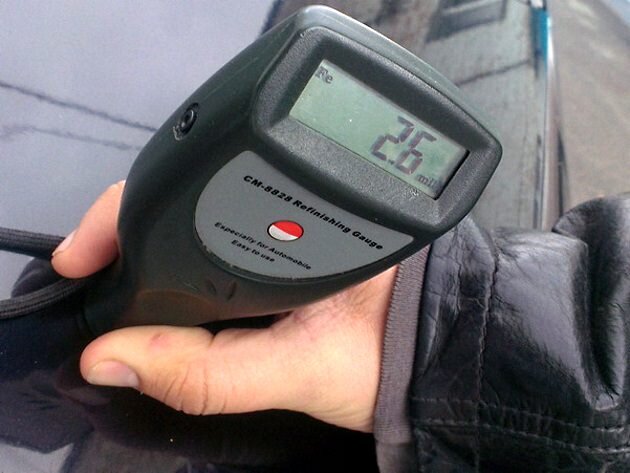 В процессе обследования, покупаемой машины с рук, на предмет наличия мест шпаклевок и перекрасок битого кузова, вам несомненно пригодится такой прибор, как толщиномер, который может легко выявить несоответствие слоя лакокрасочного покрытия (ЛКП) его заводской толщине.
