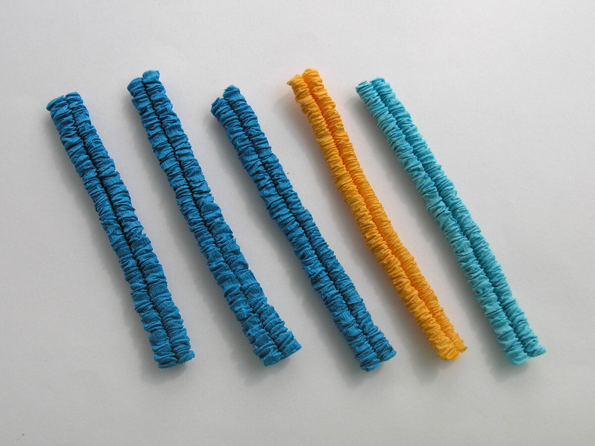 Ловись, рыбка, большая и малая, синяя и алая! Для синей рыбки скрутим три синие, одну голубую и одну жёлтую гофротрубочку. Склеим три трубочки в полотно. Разрежем полотно пополам. Повернём кусочки и склеим снова. Вырежем из полотна туловище рыбки. Склеим хвост, сделаем треугольный вырез. Подготовим одинарную трубочку для оклейки рыбки по контуру. Скатаем из гофробумаги глазок и приклеим его. Для красной рыбки скрутим две красные, одну оранжевую и одну жёлтую гофротрубочки. Склеим три трубочки в полотно. Разрежем полотно пополам, повернём кусочки и опять склеим. Вырежем из полотна туловище рыбки, приготовим трубочку для оклейки по контуру. Нарежем плавничков и склеим хвостик - капнем клея на краешки трубочки и сожмём. Приклеим глазок. Из остатков гофротрубочек склеим ещё одну рыбку! Не нужны нам удочки, мы крутим гофротрубочки! Как сделать гофротрубочку Бумага для гофротрубочек