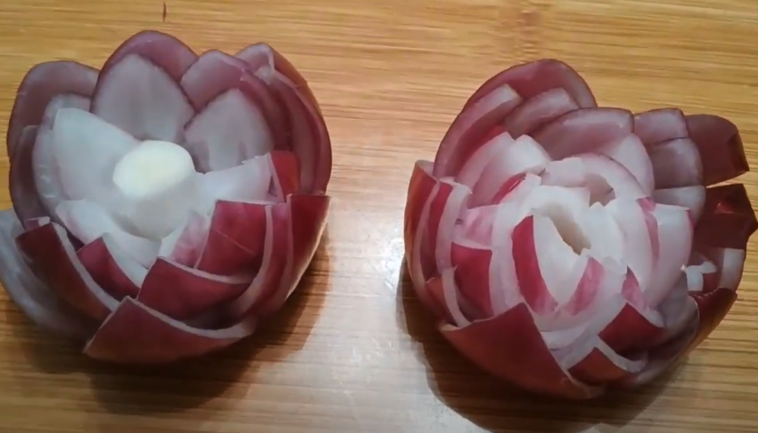 Цветок можно делать как из белого лука, так и из цветного, а также белый лук можно окрасить любыми натуральными красителями: ярко окрашенными соками (например, вишневый, апельсиновый), красным вином, соком моркови и т.д. Украшение блюд займет не так много времени, но праздничный стол заиграет красками. Лучше брать маленькую луковицу, делать из нее немного сложнее, но на блюде такой цветок смотрится лучше. Чтобы наш цветочек стал съедобным можно его поместить в маринад из воды, уксуса, соли и сахара на 15- 20 минут. Уксус и сахар берите по вкусу. Вот и все цветок из репчатого лука готов. Вынимаем его из маринада, немного встряхиваем, поправляем листики и можно украшать блюдо. Вот теперь вы знаете еще один вариант как красиво оформить блюда из обычных продуктов, которые есть всегда под рукой. Такой красотой вы можете украсить любое блюдо. Попробуйте сделать и я думаю, что у вас получится еще лучше.