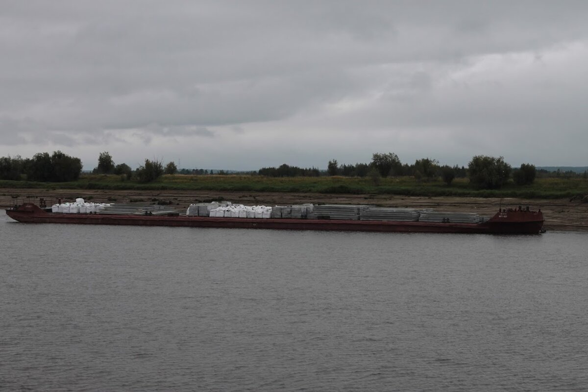 А мы плывём дальше на север. Позади Омск, Тобольск, Ханты-Мансийск, Приобье. Навстречу снова всякие суда, среди которых паром "Приобье - Андра", идущий на другую сторону Оби. На борту грузовичок с вездесущим логотипом сети "Красное&Белое". Сеть эта происходит из Челябинска, но уже захватила весь Урал и близлежащие регионы. Специализируется на продаже бухла. Недавно видел даже точку у нас тут в Мытищах. В Приобье вообще много интересного. Всякие баржи, катера.