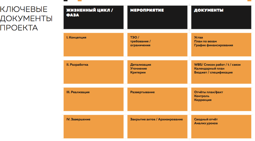 Реализация проекта происходит через несколько фаз (этапов) на каждой из которых чётко определено что необходимо сделать и в какой области. В прошлом посте их описал, сейчас расскажу подробнее.