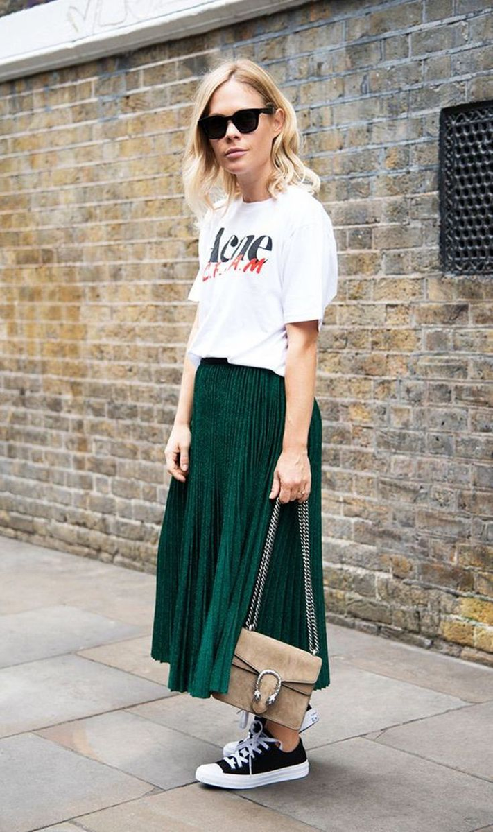Плиссе ниже колена Юбка плиссе главный элемент котельного образа, и неплохо смотрится в повседневных луках. Юбка сочетается не только с базовыми элементами но и спортивными вещами. Если Вы захотите пойти на работу в в юбке плиссе не выбирайте слишком глубокое миди, так Ваш образ будет смотреться лишком романтично. Получится образ не для работы, больше для свиданий. Большая актуальность среди плиссе это принт который может быть пестрым и разноцветным. Для того чтобы выделить юбку, сочетайте её с нейтральным верхом например: топ, футболка. Прозрачные юбки плиссе тоже в моде их продиманстрировали уже знаменитости на красной дорожке. В повседневном жизни прозрачную юбку носят с боди или комбинезона как вечерний лук. Длинная юбка плиссе Такая юбка менее универсальная, ее не оденешь на каждый день. И используйте прозрачную юбку чтобы создать вечерний образ. Прозрачную макси юбку можно носить с удлиненным блейзером на вечеринки. Такой образ будет очень модным и интригующим. Посмотрите на д