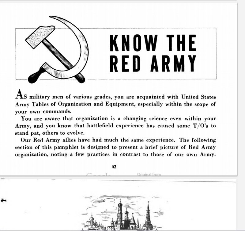Брошюра «Наш союзник – Красная Армия» военного ведомства США от апреля 1945 года. Брошюра издана для того, чтобы рассказать солдату США о красноармейцах. В этой статье я попытался поместить краткую и интересную информацию. Американский солдат, этот буклет познакомит тебя с красноармейцем, о котором ты много слышал и читал. Настало время встретиться с ним лично. Он твой друг и союзник, сражавшийся как и ты в этой войне. При контакте с Красной Армией, возможно, ты услышишь фразу (ориг.) «STOY! Ktaw ee-DYAWT!» (Стой! Кто идет!) Если вы ничего не ответите, то услышите вторую фразу (ориг.) «STOY! Strel YAHT BOO doo!» (Стой, стрелять буду!). Вам необходимо ответить (ориг.) «A-mee-ree-KAHN-skee bo-YETS» (американский боец) и убедиться, что он вас точно слышит. Затем советский солдат скажет (далее привожу только русский текст) – Один ко мне, остальные на месте! Следуйте его указаниям и помните, что он обучен стрелять, если у него будут сомнения. На посту солдат не ест, не пьет и не курит, гово
