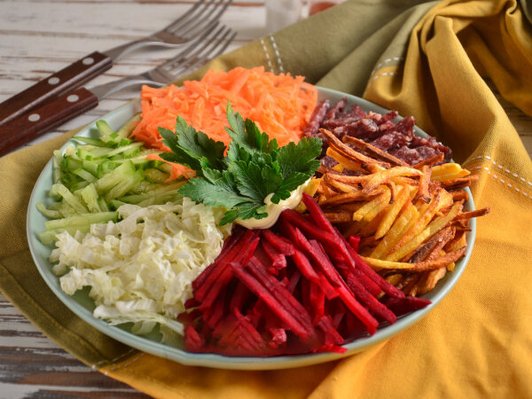 Вкусный, простой салат со свеклой (сырой), жареной картошкой, копченой колбасой и свежими овощами. Богат витаминами, клетчаткой и майонезом. Подготовьте ингредиенты для французского салата с картошкой фри. Картофель, свеклу и морковь нужно почистить и помыть. Свежий огурец и листья пекинской капусты нужно просто помыть, а колбасу - очистить от оболочки. Ингредиенты: Время приготовления: 30 минут, 166 кКалл Рецепт: Нужно нарезать мягкую часть листа пекинской капусты. Плоское блюдо нужно разделить на 6 условных секторов и на один из них выложить капусту. Свежий огурец нужно нарезать соломкой и выложить на соседний сектор. Все сектора должны быть ровными и аккуратными. Очищенный картофель нужно нарезать тонкой соломкой. После его нужно отправить обжариваться на рафинированном масле - лучше выкладывать в один слой. Картофель нужно подсолить. Морковь нужно натереть на крупной терке и выложить возле огурцов (или возле капусты). Далее очередь копченой колбасы - ее нужно нарезать тонко