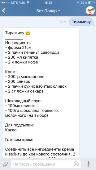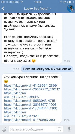 ссылки на ботов в конце статьи На базе социальной сети появляется всё больше ботов. Лайфхакер отобрал самых интересных из них. 1. Lucky Bot Lucky Bot поможет искать розыгрыши призов «ВКонтакте» по городам и категориям. Поиск осуществляется по ключевым словам, поэтому результаты находятся даже в совсем небольших населённых пунктах. Можно настроить автоматические оповещения. А тем, кто не любит неделями ждать результатов конкурса, бот расскажет о розыгрышах, подведение итогов которых состоится в текущий или на следующий день. Перейти к сообществу бота → 2. Бот Повар С помощью этого бота всегда можно найти интересный рецепт. Если нужное блюдо найти не удалось, всегда можно положиться на волю случая: отправьте «Оп», и бот выдаст рецепт на свой вкус. Ответы сопровождаются GIF-анимациями. 3. Фильмы | Бот Отправьте этому боту название жанра кино, и он предложит вариант для вечернего просмотра. А если и с жанром возникнут проблемы, то бот предложит случайный фильм или сериал. 4. Бот Джинни |