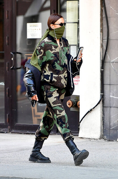Наряд российской супермодели Ирины Шейк, в котором она появилась на улицах Нью-Йорка во время пандемии коронавируса, привлек внимание журналистов модного журнала Vogue. Фотографии папарацци появились на сайте издания. Шейк была запечатлена в камуфляжном спортивном костюме Moschino, поверх которого она надела черную куртку. Ее образ дополнили массивные ботинки Bottega Veneta и шарф цвета хаки, который модель повязала на лицо вместо защитной маски. По информации издания, несмотря на пандемию и обязательный режим самоизоляции, папарацци часто удается сфотографировать звезд на улицах Нью-Йорка. Журналисты отметили, что Шейк вышла из дома без защитных перчаток, но в целом основные меры безопасности были соблюдены.