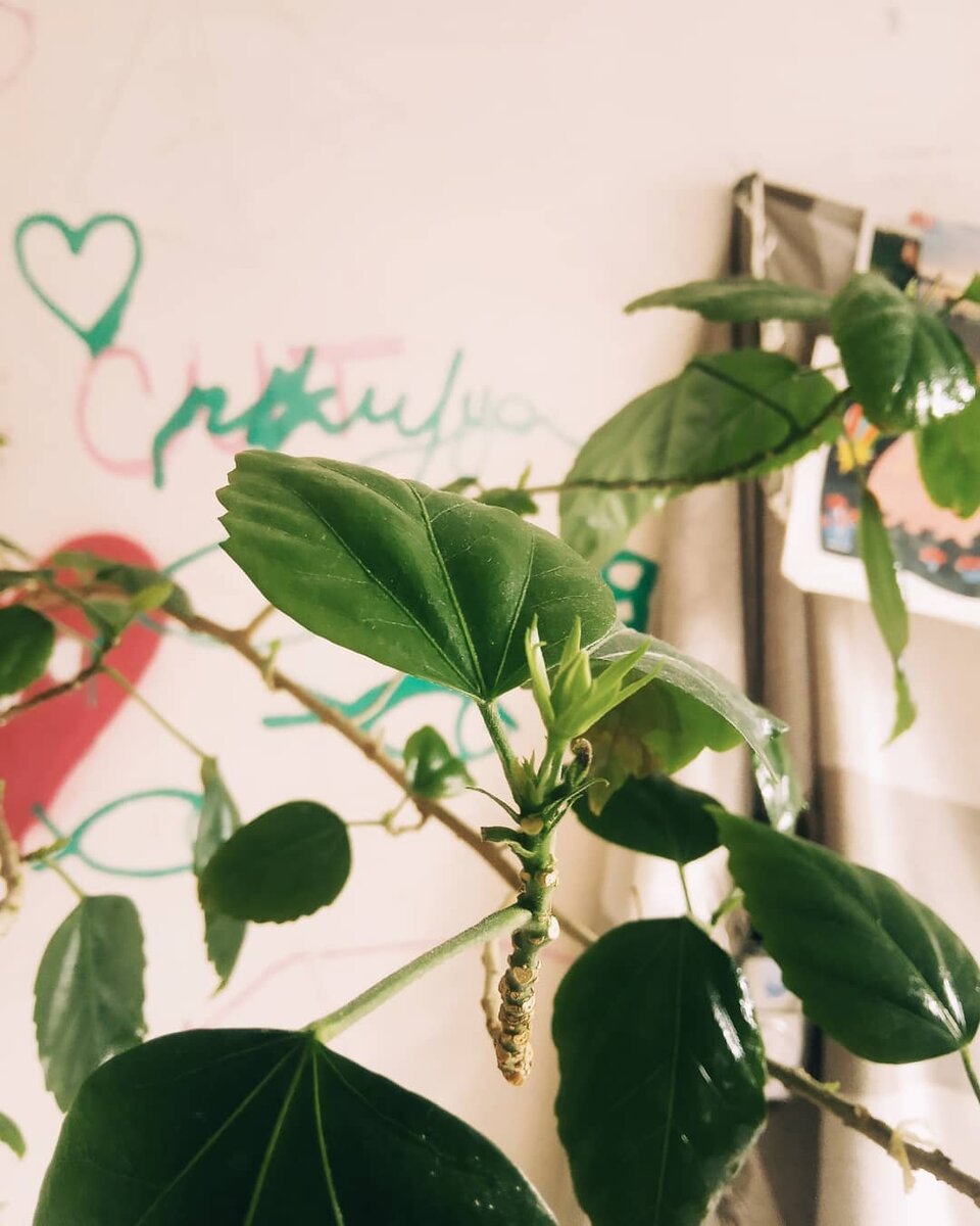 Очень радуюсь тому, что гибискус снова начал отращивать листочки. До этого мой кот перевернул горшок с растением, ветки переломались, - и я очень расстроилась. Отодвинула растение в коридор, в самый пыльный угол. Ходила мимо китайской розы и упорно делала вид что не замечаю. Хотя на самом деле каждый раз кололо сердечко, видя как растение погибает.