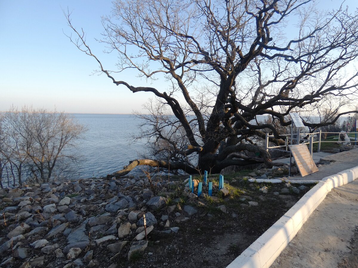 Во время нашего мартовского путешествия мы не раз любовались старыми-старыми дубами - природными памятниками. Пару таких дубов я показывала в ролике про Белгород. Но особенно нас поразил дуб-патриарх на территории неработающего санатория в городе Дубовка Волгоградской области. Этот необычный дуб стоит на краю обрыва над Волгоградским водохранилищем. Санаторий не действует, но он не заброшен. Одни здания закрыты и огорожены, в других идёт ремонт. На входе сидит охрана, но она спокойно пропускает гуляющих. Сразу бросается в глаза то, что совсем недавно возле дуба кипела жизнь: здесь привязаны ленточки, стоят полки из-под сувениров и даже до сих пор можно сфотографироваться в виде кота учёного. Сам дуб, конечно, поражает: высотой 18 метров и диаметром около 7 метров, сильно разветвлённый... На стволе дерева остались следы осколков бомб, сброшенных фашистами во время Сталинградской битвы. Дубу более двухсот лет! Дуб признан самым большим и самым старым деревом всей Волгоградской области.