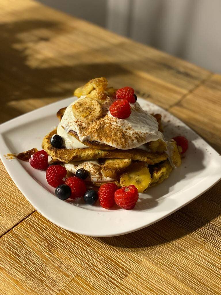 Блины из золотистого льна и чиа с карамелизованными бананами