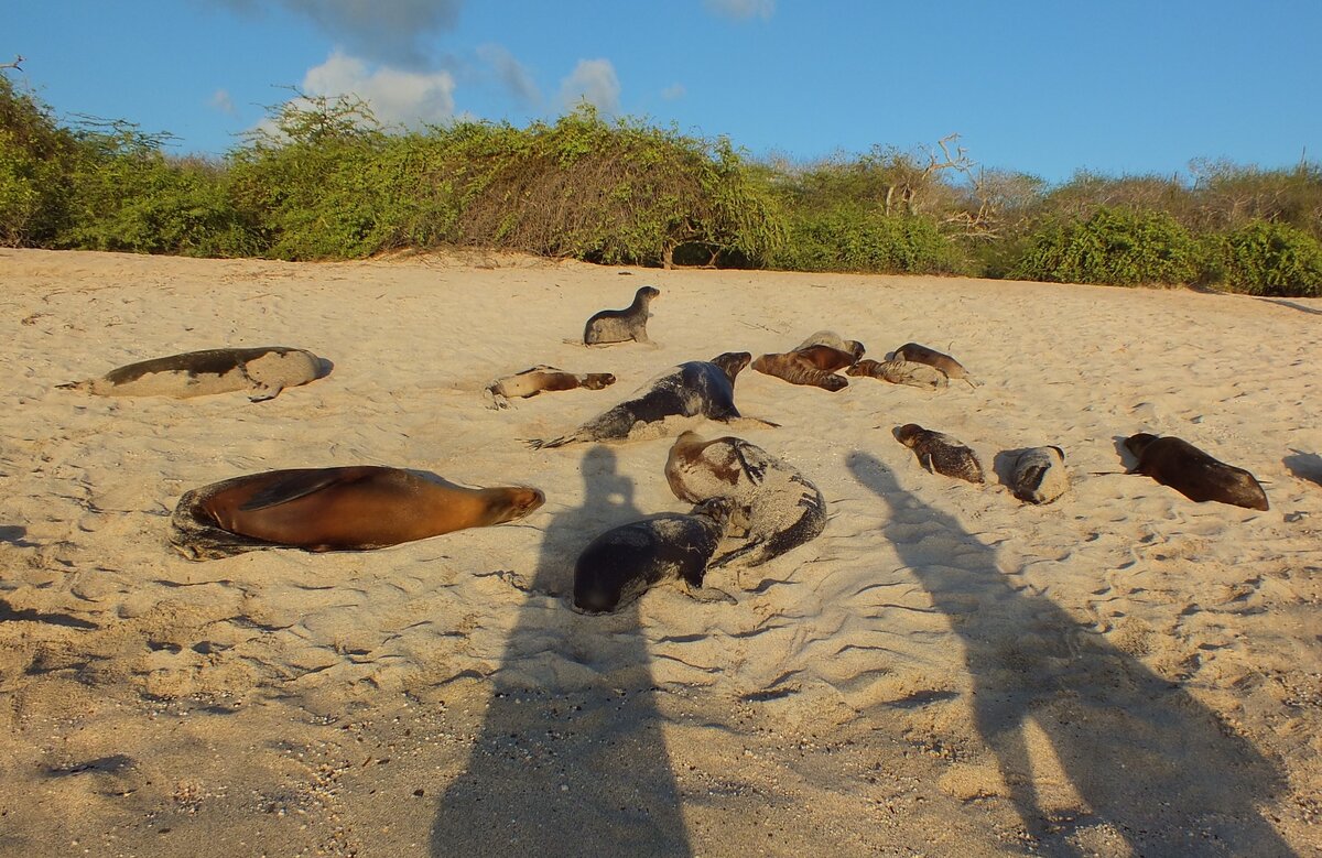На острове Сан-Кристобаль (Галапагосы) живут морские котики. Они там повсюду: в городе, в отеле, на пляже. На людей внимания морские котики не обращают. Фото темное, но здесь морской котик просто скатывается с горки :) Вот он. На людей никакого внимания. Надо уживаться рядом :)
