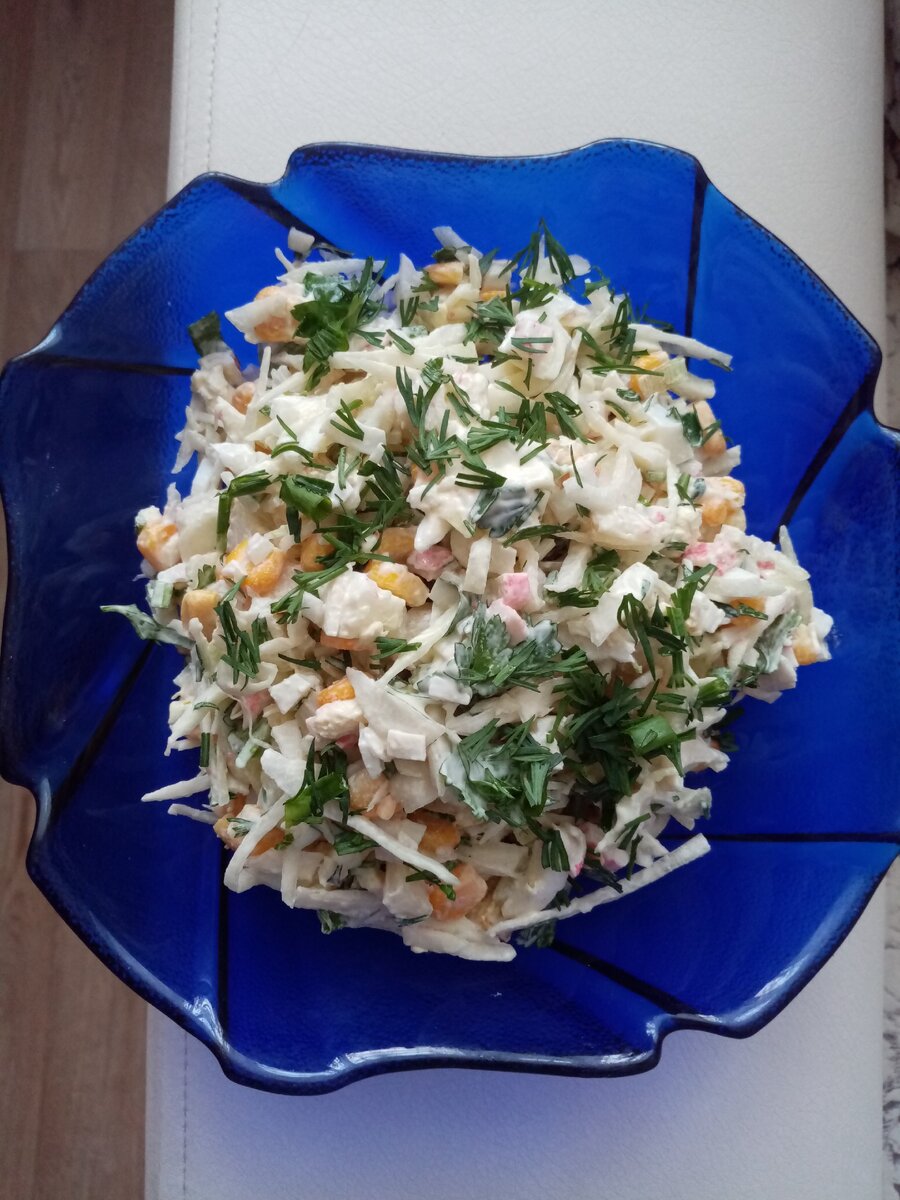 Здравствуйте всем! Предлагаю вам приготовить вкусный салат по моему рецепту. Для приготовления салата понадобиться вот такие продукты. Еще пучок зелени. Пол кочана капусты(а можно и весь кочан, если кто очень любит капусту) мелко нашинковать и помять руками, чтобы сок вышел. Мелко крошим лук и добавляем к капусте. Крабовые палочки, яйцо режем кубиками и добавляем к капусте. Туда же добавляем кукурузу. Режем кубиками грушу. Груша должна быть мягкой и сочной. Зелень режем мелко. Все отправляем в нашу миску. Я соль не ложу. Заправить майонезом. Попробуйте приготовить этот салат. Пишите комментарии. Если понравился рецепт- нажмите класс. Подписывайтесь, пожалуйста, на мой канал. А я вам желаю не болеть и быть всегда счастливыми!