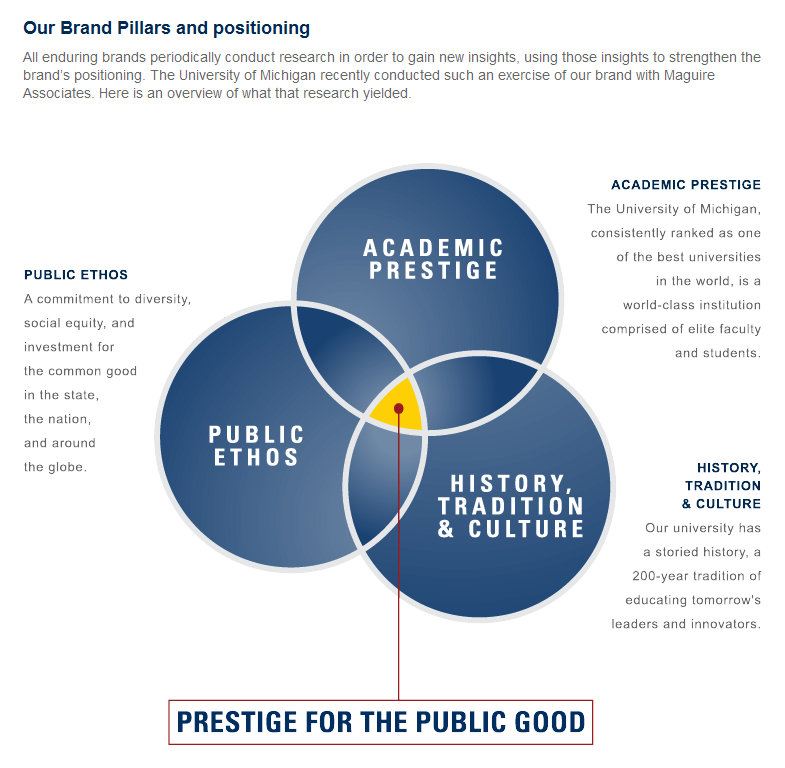 Университет Мичигана проделал большую работу по определению своей миссии в начале своего руководства бренда. Их стратегия бренда начинается с определения опор бренда и позиционирования.
