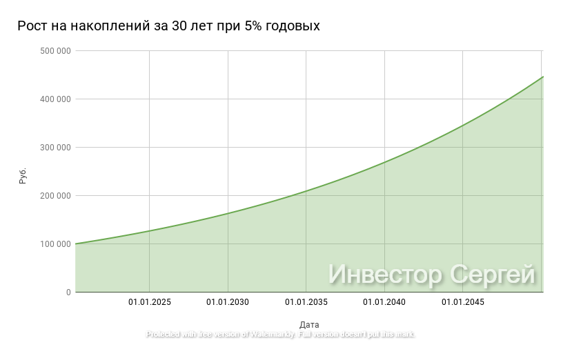На получение полностью начальной суммы накоплений нам потребуется сначала 12 лет. А через 30 лет - около 3 лет.