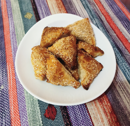 Ингредиенты: творог - 1 пачка курага-горсть чернослив - горсть изюм-горсть слоеное бездрожжевое тесто - 1 упаковка яйцо- 1 штука Приготовление: Начинка. Сухофрукты промыть и замочить в кипятке на 10 минут. Творог пробить блендером, добавить мелко нарезанные сухофрукты. Хорошо перемешать. Тесто разморозить, тонко раскатать . Нарезать на небольшие квадратики, выложить начинку. Слепить треугольники. Выложить на противень. Сверху каждый конвертик обмазать яйцом. Можно украсить кунжутом. Выпекать при температуре 180 градусов 10 минут. Приятного аппетита.
