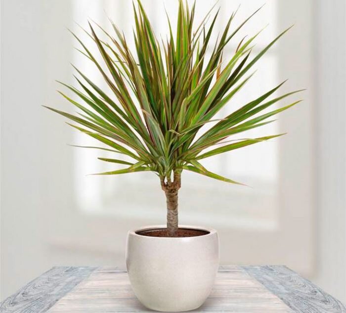 Драцена – неприхотливое и очень красивое комнатное растение, похожее на небольшую пальму. Может расти как в небольших комнатах, так и в просторных помещениях. Взрослые экземпляры достигают внушительных размеров. Нетребовательность этого растения позволяет выращивать его даже неопытным начинающим цветоводам. Как ухаживать в домашних условиях за комнатным цветком и как выглядит цветущая драцена на фото? Каким способом можно рассадить драцену в домашних условиях? Об этом и многом другом вы прочитаете в нашей статье. Уход за драценой в домашних условиях (кратко) Описание растения и его виды Драцена – древовидное растение, имеющее толстый, жесткий и слабо ветвящийся ствол, достигающий в закрытом помещении высоты 3 м. На стволе расположены сидячие, удлиненные листья ланцетной формы. Их длина зависит от вида и может достигать 50 см. У молодого растения ствол покрыт листьями, но со временем они начинают желтеть и отмирать. Ствол оголяется, только на его вершине остается пышная шапка листьев.