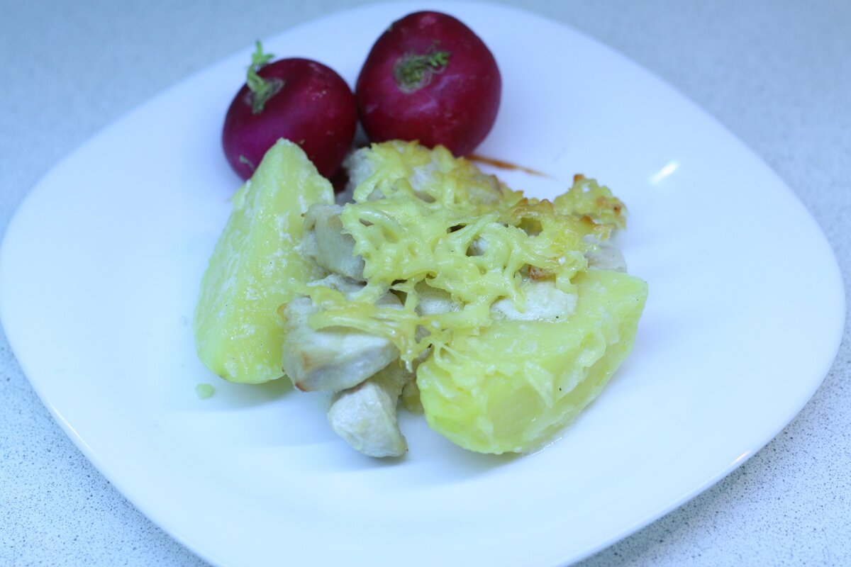 Простой и вкусный рецепт картошки с куриной грудкой.