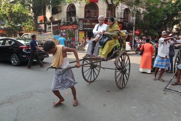 Фантастика, но в наше время есть места, где можно прокатиться на коляске, в которую запряжена не лошадь.. а обычный человек! Это город Калькутта - крупнейший мегаполис Индии. Суровые крепкие парни таскают пассажиров практически в буквальном смысле на своём горбу. Конечно, Калькутта - современный мегаполис. Тут есть и метро, и дорожные эстакады и электрички, и банки с кондиционерами. Но в Калькутте сильны традиции. Здесь искусственно сохраняют очень многие традиционные явления. Такие, как трамвай, например. Или жёлтые ретро-такси. Интересно, что слово "рикша" исходно изначает именно такую повозку - запряжённую человеком. Это уже потом появились велосипедные и мото аналоги. Появились рикши в 1870-х годах в Японии (само слово - искажённое от трёх японских иероглифов "дзинрикися", что значит "человек", "сила", "повозка"). А уже в 80-х годах они распространились во многих азиатских странах, например в Гонконге, Сингапуре, Малайзии и Китае. Индия не была исключением - наибольшую популярно
