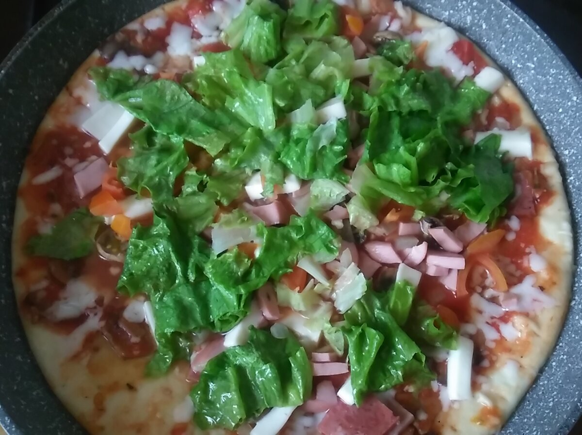 Даем пол минуты пропарится пицце под крышкой. Снимаем ее и поддеваем края и смотрим корж в центре. Нарезаем салатные листья и добавляем сверху. Проверять корж пиццы и накрывать крышкой придется много раз. От этого зависит подгорит корж или приготовится.