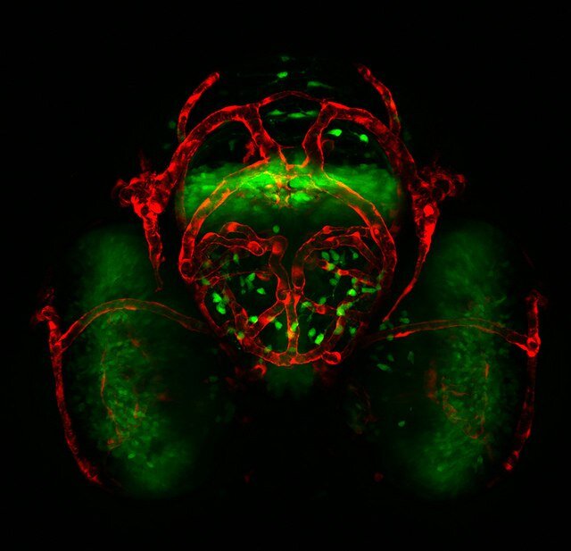 Остаться парализованным из-за повреждения позвоночника – это, безусловно, трагедия как для пациентов, так и для их близких. То, как быстро восстановится спинной мозг при повреждениях, зависит от того, как скоро нейроны протянут новые отростки, аксоны, через место повреждения. У низших позвоночных (например, рыб) в этом активно принимают участие глиальные клетки. Размножаясь и перемещаясь к месту повреждения, они протягивают «мостик» через него, тем самым создавая опору для роста аксонов. В статье в журнале Science, опубликованной в 2016 году, учёные из США и Германии рассказывают, что для образования этого мостика из глии и для регенерации аксонов у рыб необходим фактор роста A соединительной ткани (CTGFa, connective tissue growth factor а). Мозг данио рерио. Credit: Jessica Plavicki, Peterson Lab, University of Wisconsin at Madison Факторы роста – это вещества, которые секретируются клетками во внешнюю среду и стимулируют рост других клеток. За их открытие Рита Леви-Монтальчини и Ст