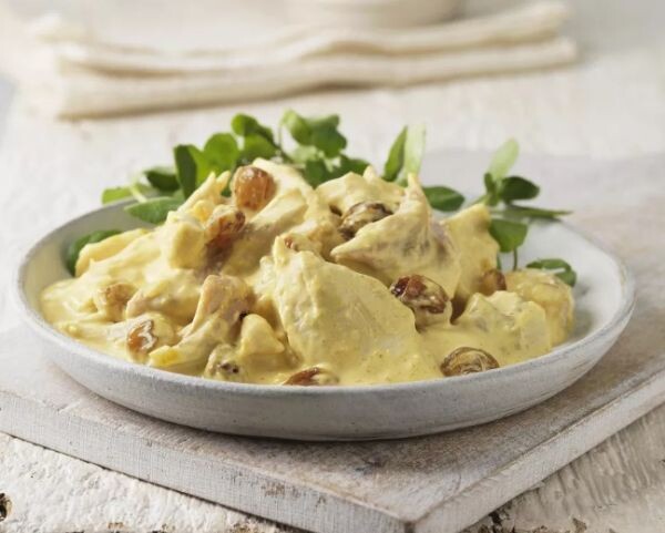 1 ст. л. растительного масла 1 небольшая головка репчатого лука - очистить и мелко нарезать 1 ст. л. мягкой пасты карри 1 ч. л. томатной пасты 1 ст. л. красного вина 150 мл куриного бульона 1 лавровый лист Морская соль и черный молотый перец (по вкусу) 1 ч. л. сахара Лимонный сок (от половины лимона) 450 мл майонеза 4 ст. л. абрикосового джема 2 ст. л. жирных сливок - слегка взбить 450 г вареной курицы - нарезать кубиками 2 ст. л. обжаренных хлопьев миндаля