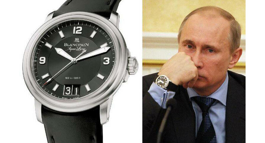 Часы, с которыми чаще всего появляется перед общественностью Путин, − Blancpain Leman Aqua Lung Grande Date. Это элегантные часы в строгом стиле из нержавеющей стали с черным циферблатом. Набор функций в этих часах простой: часы, минуты, секунды и большой указатель даты на 6 часов. Часы приводит в действие автоматический механизм Blancpain калибр 6950 с запасом хода до 70 часов. Часы выпущены ограниченной серией в 2005 экземпляров, сейчас сняты с производства.