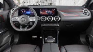 Внутри дизайн приборной панели практически полностью снят с А-класса. Это означает, что есть современный дизайн приборной панели, подчеркнутый тремя центральными вентиляционными отверстиями. Они имеют вид лопастного вентилятора, расположенными под парой цифровых дисплеев.