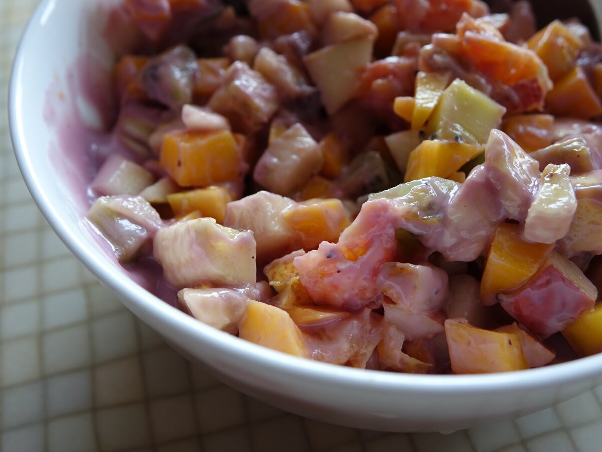 Ингредиенты: Манго 1 шт. Красный апельсин 2 шт. Киви 3 шт. Банан 1 шт. Груша 2 шт. Йогурт 1 шт. Все ингредиенты нарезать кубиками и заправить йогуртом. Приятного аппетита!