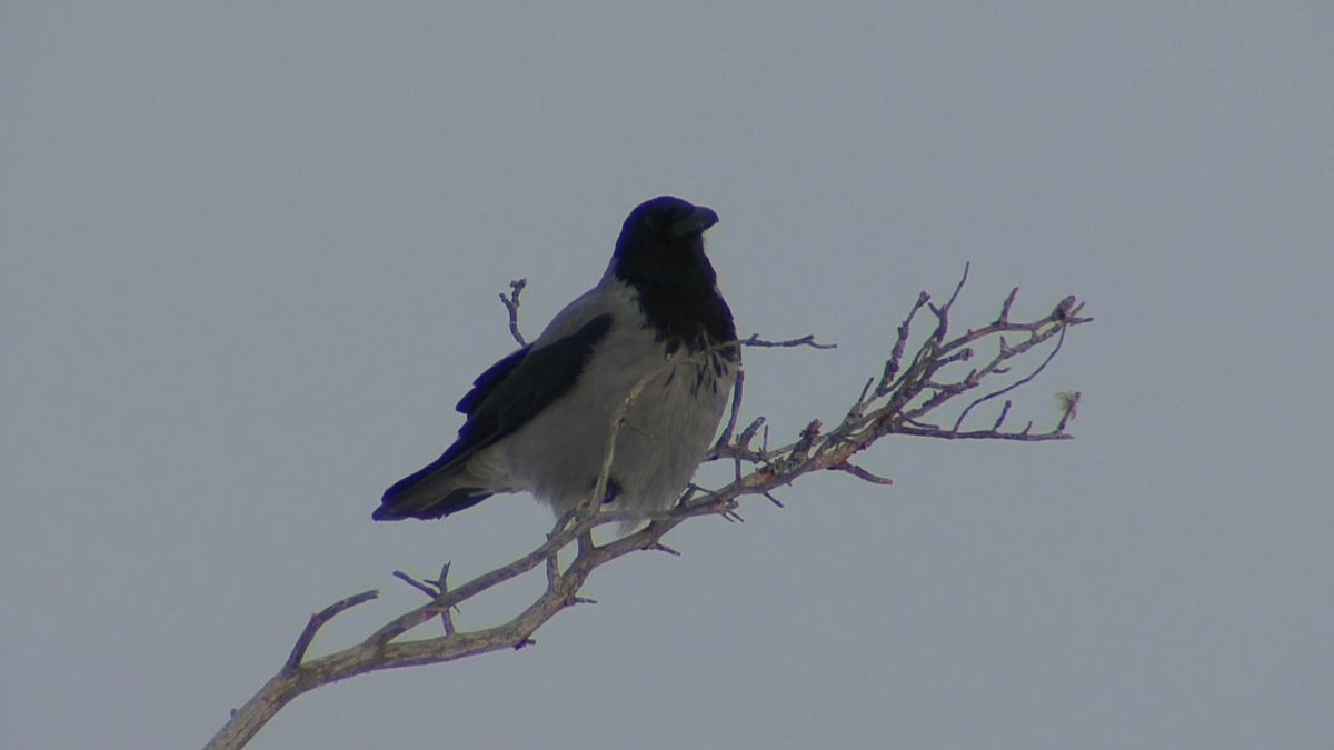 Я включила телевизор, села пить чай лицом к окну и увидела, что серая парочка необычайно взволнована: оставила своё потомство, слетела с гнезда на соседнюю берёзу, сидят рядышком, клювами к полыхающим окнам напротив, и по очереди тревожно каркают, громко на одной ноте, по 3 раза равномерно, с одинаковым интервалом.