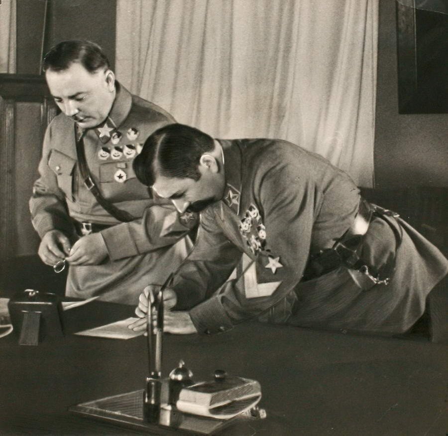 Климент Ефремович Ворошилов. Российский революционер, советский военный, государственный и партийный деятель, участник Гражданской войны, один из первых Маршалов Советского Союза. С 1925 года нарком по военным и морским делам, в 1934—1940 годах нарком обороны СССР. В 1953—1960 годах — Председатель Президиума Верховного Совета СССР. Дважды Герой Советского Союза, Герой Социалистического Труда.