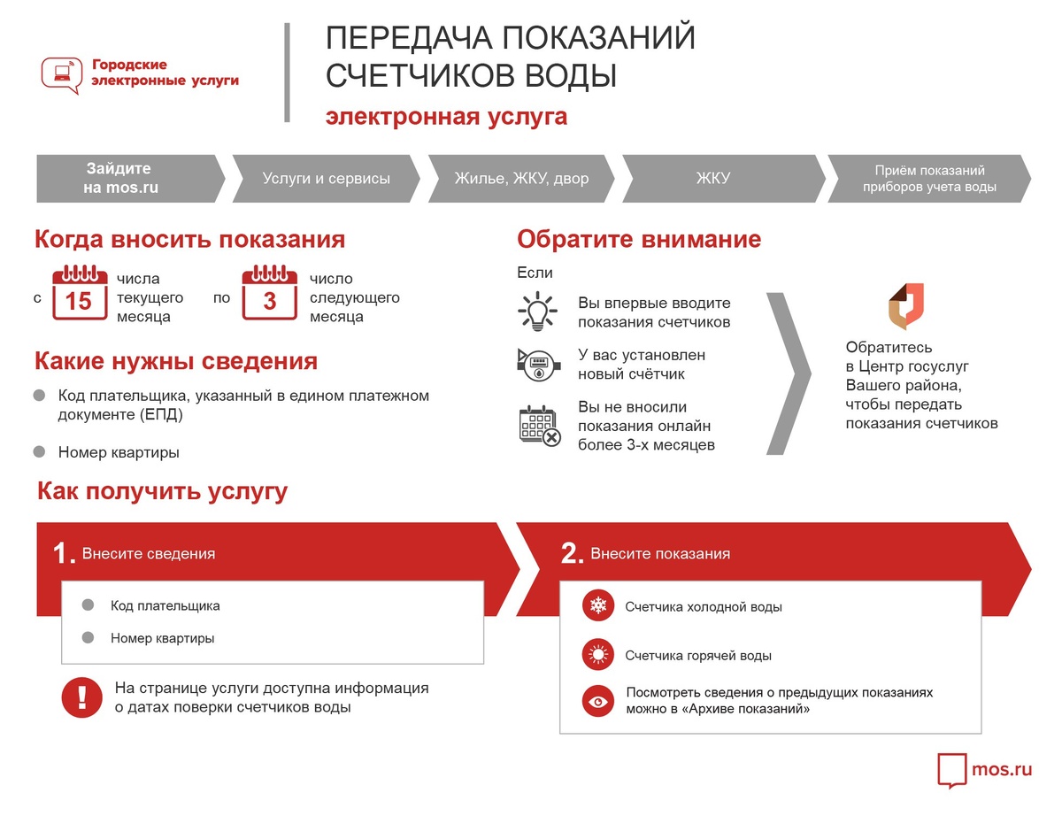 Передача показаний счетчиков воды в Москве. На сегодняшний день известно несколько способов: Ниже приведены пошаговые инструкции по каждому способу. Вам остается выбрать из них наиболее удобный именно для вас. Помните, что прежде чем начинать передавать показания счетчиков, их необходимо зарегистрировать в вашем районном ГКУ ИС/МФЦ. Адреса выложены на Портале городских услуг. Как передать показания через интернет Несколько лет назад существовало множество бесплатных порталов для передачи показаний. Сегодня существует два способа передать показания счетчиков воды через интернет: Портал городских услуг и мобильное приложение. На Портале городских услуг mos.ru (ранее pgu.mos.ru) Услуга предоставляется для физических лиц совершенно бесплатно. Аналогичным образом вы можете зарегистрироваться и отправлять данные счетчиков через Личный кабинет на сайте ГКУ «Центра координации ГУ ИС», адрес сайта: www.gu-is.ru. Через мобильное приложение Как передать показания воды по телефону Наберите но