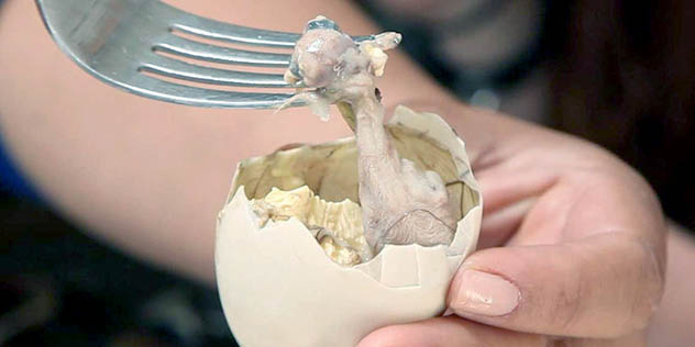 Балут-популярная уличная еда, которую можно найти на многих придорожных рынках. Может показаться тошнотворным есть частично развитую утку, но это блюдо считается деликатесом во многих местах, таких как Китай. Оплодотворенную яйцеклетку варят около 25 минут и съедают, пока она еще теплая. Часть желтка описана как насыщенная и сливочная с общим мягким вкусом, а некоторые яйца содержат кости и перья, которые съедобны, что (согласно местным верованиям) делает мужчин, которые их едят, более мужественными.