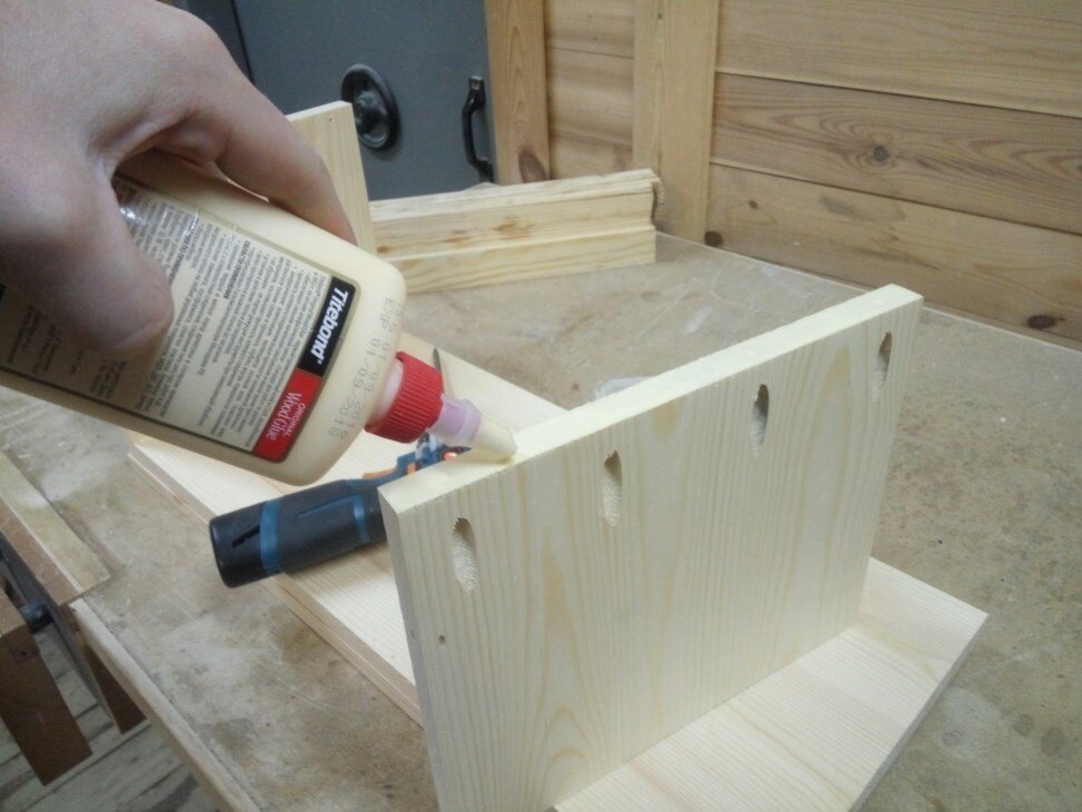 Для того, чтобы дополнительно усилить соединение деталей, понадобится столярный клей. Каждая часть тумбы тщательно склеивается.