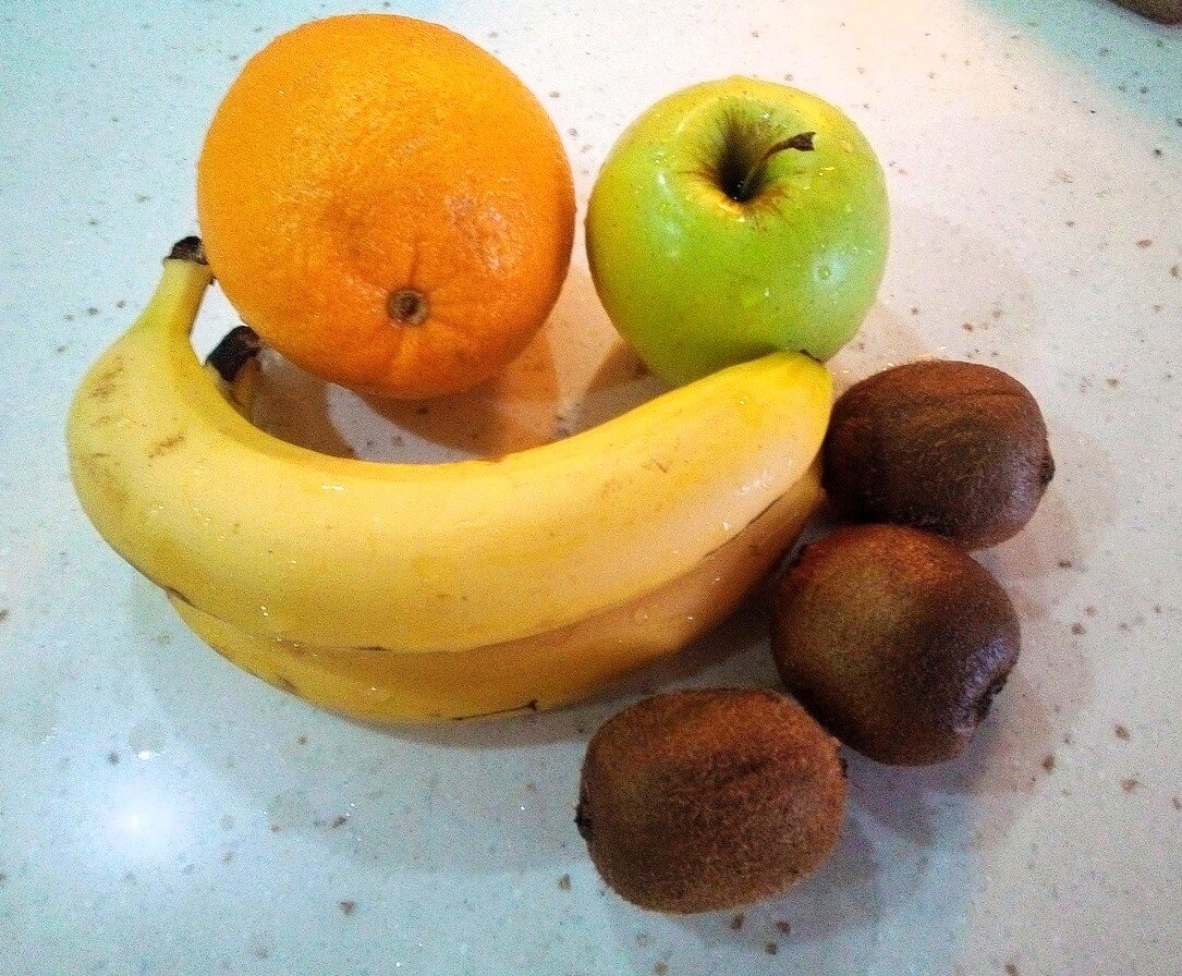 Фруктовый салат один из самых полезных десертов. Вариантов фруктового салата множество: фруктовый салат с йогуртом, фруктовый салат со сливками, со взбитыми сливками, с мороженым, со сметаной, с медом. Ингредиенты фруктового салата так же разнообразны. Можно сочетать любые фрукты, на сколько хватит вашей фантазии и доступность ингредиентов. Ингредиенты Сделаем самый простой фруктовый салат. Берем фрукты, что есть дома: 1) киви - 3шт 2) банан - 2 шт 3) яблоко - 1 шт 4) апельсин - 1шт Приступаем к готовке Фруктовый салат режется крупными кусочками. Очищаем и режем киви. Банан очищаем и режем Яблоко можно оставить с кожурой, но лучше всего его очистить. Также режем на кусочки. Очищает апельсин. Каждую дольку режем на кубики Все ингредиенты нарезаны. Осталось заправить салат и перемешать. Заправлять салат можно чем угодно: йогур, мороженное, сливки взбитые. Я взяла йогур, он просто был дома в холодильнике. Перемешиваем и получаем готовый вкусный десерт. Приятного аппетита! Итог по готовке