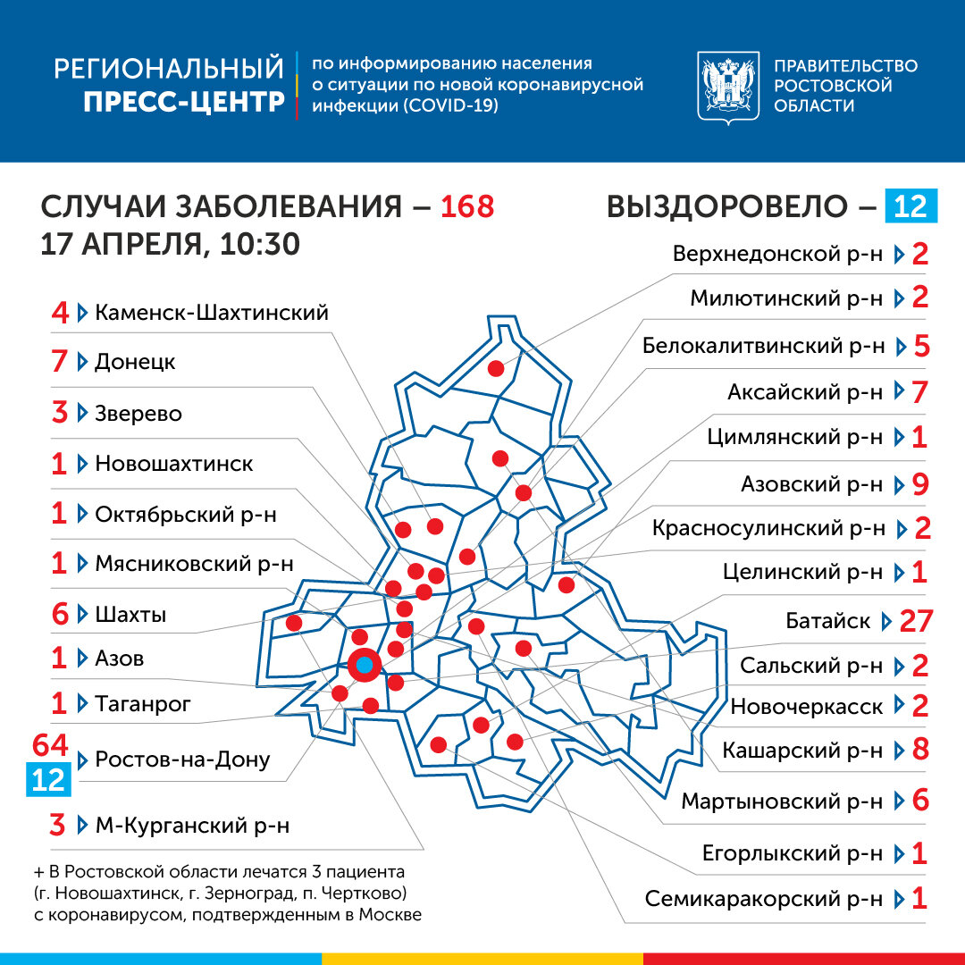 За минувшие сутки в Ростовской области подтвердили ещё 23 случая заражения коронавирусной инфекцией. Общее число заболевших на утро 17 апреля — 168 человек.
