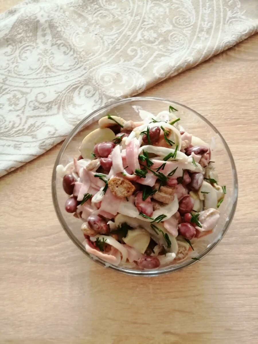 Всем большой привет! Готовлю простой и необыкновенно вкусный салатик на скорую руку. Копченное мясо и сухарики в салате делают его ярким, пикантным, сытным, как мне кажется такое сочетание делает салат очень и очень вкусным.