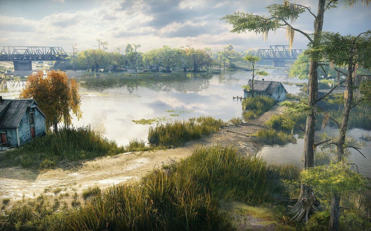 Описание Игровая локация оформлена в стиле провинциальной Америки 1930-х годов с привнесением соответствующего колорита: усадьба, хлопковые плантации, рекламные щиты, автомобили и главное - дубы особого вида, давшего название карте. В центре локации расположено большое озеро с заболоченными берегами. На одном фланге находятся два узких железнодорожных моста и броды, на другом - небольшой городок, как с деревянными, так и кирпичными постройками. Одна база расположена на северо-востоке в районе вокзала, другая - юго-западе возле фабрики и усадьбы. Сами базы находятся на открытых участках, что облегчает их защиту. Тактика С точки зрения тактики игровая локация делится на три части: город, где воюют преимущественно тяжелые танки, район железной дороги на востоке, где сталкиваются СТ, и заболоченная низина у озера, очень удобная для легких танков и неожиданного прорыва к артиллерии. Обилие растительности и построек разной степени прочности создают хорошие условия для ПТ-САУ и любителей за
