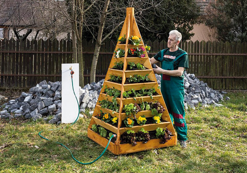 Выращивать в подставке в виде пирамиды удобно. Вы также можете поставить небольшую пирамиду на балконе, и благодаря колесам вы можете легко повернуться растения к солнцу.