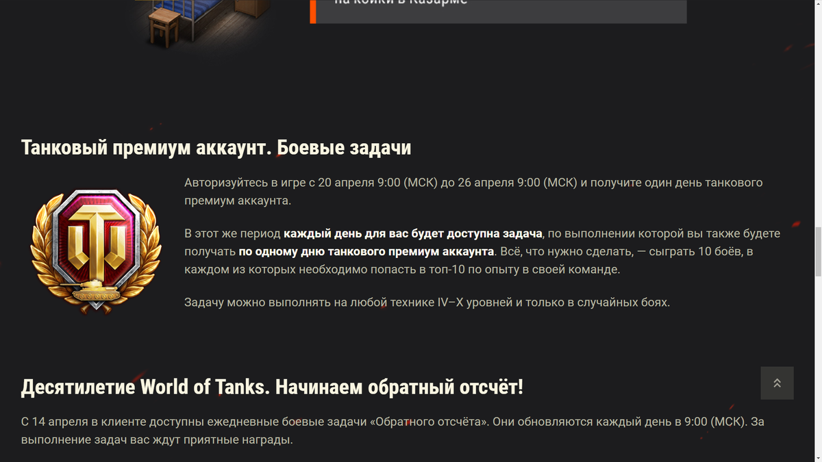 Шествие иностранной хвори по нашей маленькой стране продолжает набирать обороты и поэтому наши "любимцы" из Wargaming решили что будет отличной идеей будет еще разок раздать премиум аккаунт всем кто играет в World of Tanks. Затея, в принципе, не самая плохая. Начинается этот аттракцион невиданной щедрости с 20 апреля. Однако в этот раз реализация сильно изменилась. Итак, условия получения премиум аккаунта следующие: 1. Зайти в игру (действует один раз на аккаунт)