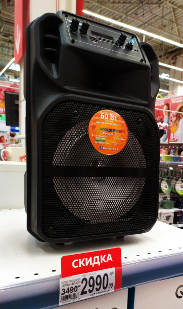 Пока прогуливался с тележкой по торговому залу магазина "Ашан", который находиться в Краснодаре, забрёл в отдел техники и электроники.И обратил внимание, что выставлено много музыкальных аудио систем от маленьких до больших,Китайского производства по умеренной цене.Я не скажу, что совсем дешево, но и не дорого.И в этом обзоре хочу предложить вам к просмотру, что сейчас в "Ашан" можно купить из музыкальных аудио систем. Музыкальны центр от фирмы TELEFUNKEN мощностью 60 ватт со встроенной батареей, которой хватит на 10 часов прослушивания музыки без сетевого шнура.Есть функция bluetooth для прослушивания мелодий с телефона,световая яркая подсветка, место для карт памяти,FM радио и хорошие низкие частоты.Цена 2990 рублей. А эта модель от TELEFUNKEN уже послабее.Мощность 40 ватт, но в комплекте есть микрофон для караоке.Встроенная батарея на 10 часов прослушивания, радио и место для карт памяти.Цена 1990 рублей. Компактная переносная музыкальная аудио система MAX.Изготовлен из ударопрочног
