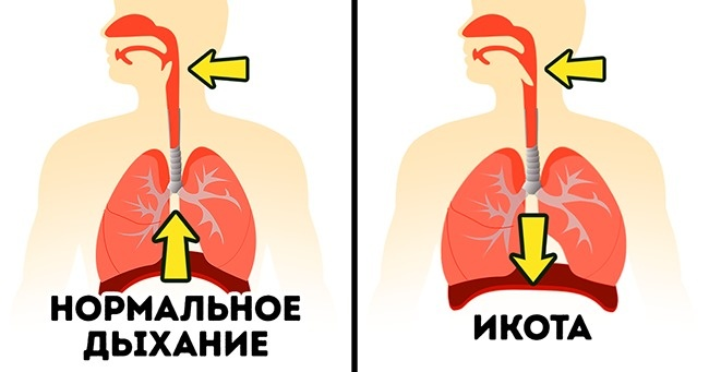 Вот вы когда-нибудь задумывались: зачем человеку икать? Какой в этом смысл? Ну вот и никто до сих пор наверняка не знает. А что вообще такое икота и как её описать? Описываю. У нас есть диафрагма: Диафрагма — такая мышца в форме купола. Она находится под лёгкими и отделяет грудную полость от брюшной. Важнейшая функция диафрагмы — участие в дыхании (сокращаясь и расслабляясь, она помогает менять давление в грудной полости, чтобы воздух входил и выходил из лёгких) Иногда от переохлаждения, переедания, алкогольного опьянения, и вообще просто так, без особой причины, часть мышечных волокон диафрагмы начинает самопроизвольно в определённом ритме сокращаться. Человек ощущает это как короткие и интенсивные дыхательные движения, которые он не может контролировать. При этом во время каждого такого сокращения резко схлопываются голосовые связки, перекрывая вход в трахею, и получается знакомый всем звук “ик”. Остаётся только подумать, что кто-то вспоминает нас любимых, продолжить делать дела, а