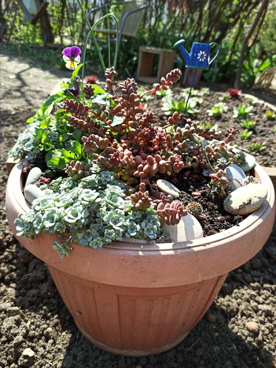 У меня прекрасный сад, которому я посвящаю много времени. Особенно сейчас, когда установились теплые деньки. Люблю цветники и за годы создала уже их немало. Черпаю вдохновение в книгах, журналах, он-лайн ресурсах. Но люблю придумывать что-то сама, экспериментировать с сочетаниями различных растений. Порой получаются интересные комбинации. Одной из таких я делюсь с вами в этой статье. Надеюсь, она будет вам полезна. Для своего цветника я выбрала крупный горшок. На них уложила хороший слой дренажа. Вода не должна застаиваться. Просеяла садовую землю и смешала ее с перегноем. Благо, после зимы он в достатке. В саду у меня предусмотрено специальное место для компоста. В центр цветочной композиции я посадила Седум Шталя. Это очень интересное и эффектное растение. Родом из Мексики. Суккулент с мясистыми листьями. На солнце он приобретает насыщенный бордовый оттенок. Его стебель вырастает до 25 сантиметров. Рядом с седумом Шталя посадила Седум Палмера. Он образует шапочку с голубоватым от