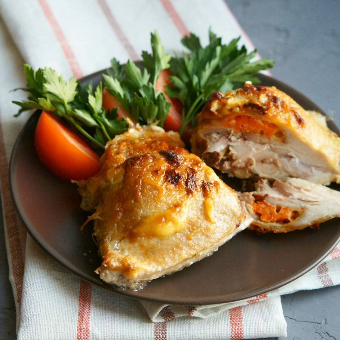Готовим начинку для курицы, для этого натираем сыр и морковь на крупной тётке, добавляем соль, перемешиваем. Затем надрезаем кусочки курицы таким образом, чтобы получили кармашки, которые можно будет начинить сыром и морковью. Чтобы начинка не вывалилась, закрепляем края кармашков зубочистками (,их потом можно будет убрать).