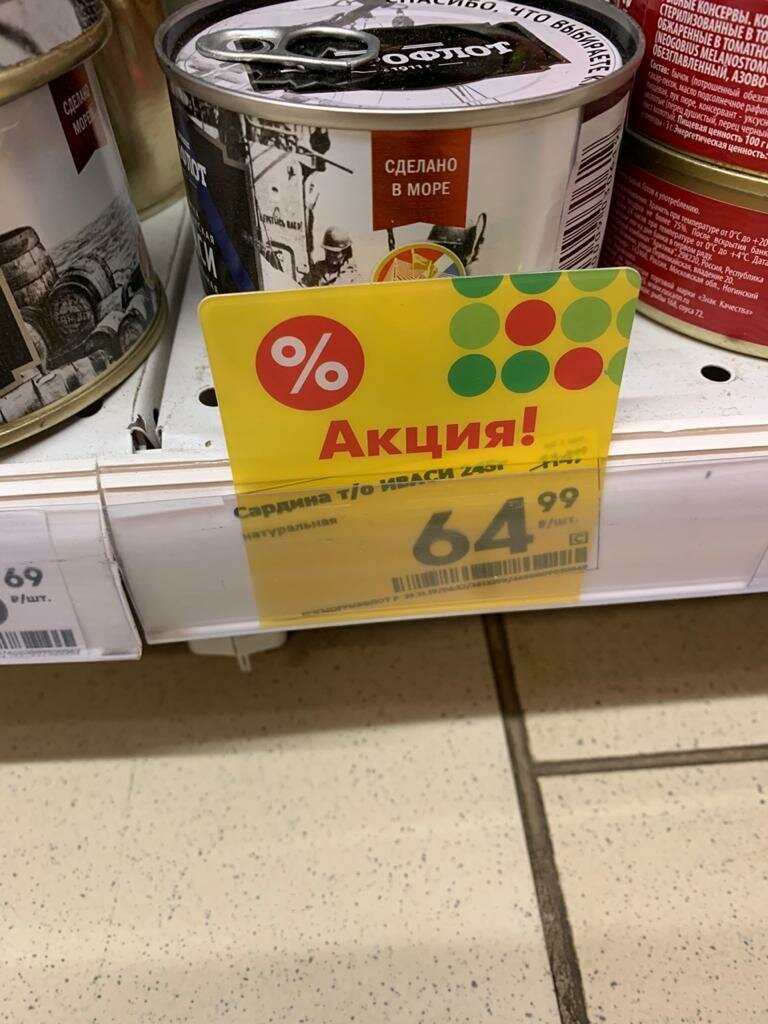 Пошла я в Пятёрочку и стала выбирать. Выбор мой выпал на консервы Иваси от торговой марки доброфлот. На консервы была акция, стоила она 114. 99, а сейчас всего 64.99, целых 45 рублей скидка. Купила, сейчас расскажу и покажу какими они оказались внутри. Ну во-первых обратила внимание на состав: только рыба, соль и специи. Состав отличный. Так же производитель крупными буквами указывает о том, что рыбные консервы изготовлены в море из свежевыловленной рыбы. Бесспорно это огромный плюс, консервы приготовленные из свежей рыбы должны быть самого высокого качества и очень вкусными. Открыла банку. Что вижу: аккуратно уложенные кусочки рыбы в прозрачном масле. На вид аппетитно и запах приятный.