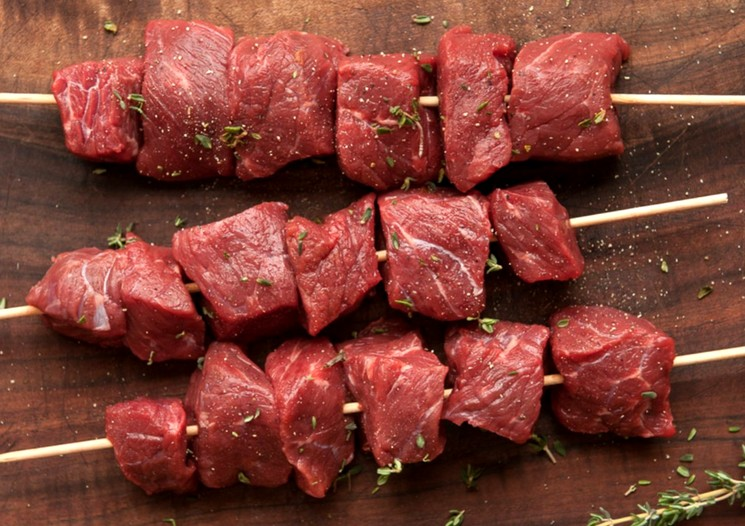 - Осталось мясо перед самой готовкой посолить, поперчить и нанизать на шампуры (по желанию можно чередовать мясо с луком).